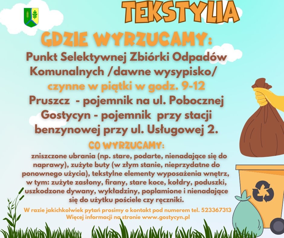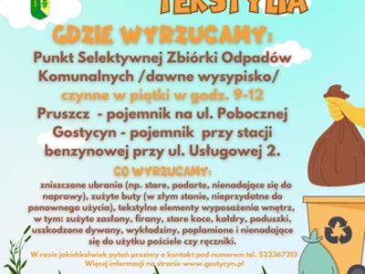 Ponadto w dwóch miejscowościach naszej gminy (Pruszcz i Gostycyn) stoją specjalnie oznaczone pojemniki, gdzie można wrzucać zużyte tekstylia