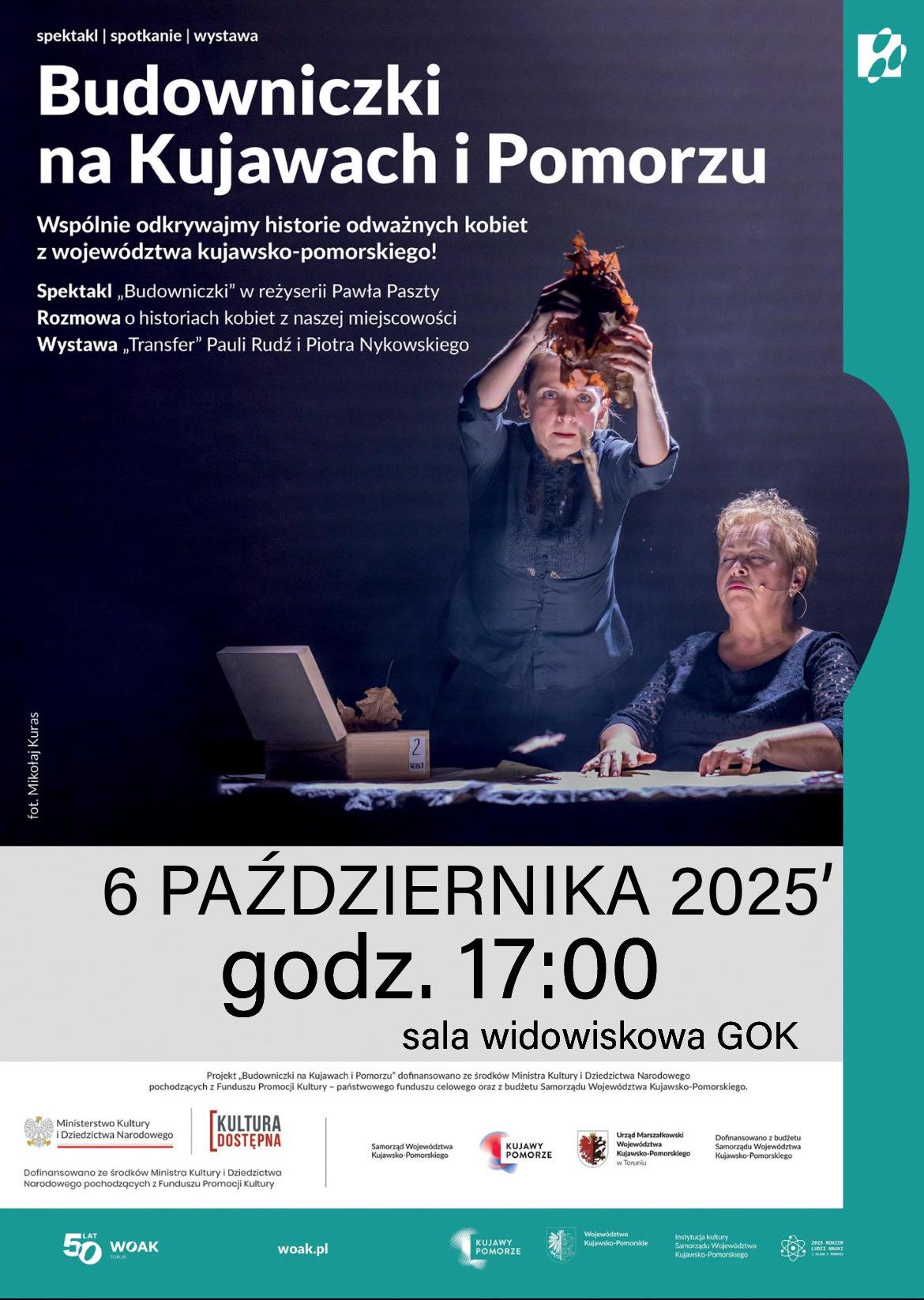 Już w poniedziałek, 6 października 2025 r.,o godz. 17:00, w sali widowiskowej GOK w Gostycynie, będziemy mogli zobaczyć spektakl „Budowniczki na Kujawach i Pomorzu”, przygotowany przez Wojewódzki Ośrodek Animacji Kultury w Toruniu. Punktem wyjścia do projektu jest myśl: „jeśli nie znamy historii kobiet, to nie znamy połowy historii”. Twórcy chcą ukazać, jak ogromny wpływ miały kobiety – liderki z małych miejscowości naszego regionu – na rozwój kultury, edukacji i życia społecznego.