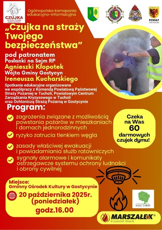 Wójt Gminy Gostycyn Ireneusz Kucharski wraz z Posłanką na Sejm Agnieszką Kłopotek serdecznie zapraszają mieszkańców na spotkanie edukacyjno-informacyjne dotyczące bezpieczeństwa pożarowego, organizowane we współpracy z Komendą Powiatową Państwowej Straży Pożarnej w Tucholi oraz Powiatowym Centrum Zarządzania Kryzysowego w Tucholi i Ochotniczą Strażą Pożarną w Gostycynie do wzięcia udziału w kampanii edukacyjno-informacyjnej.