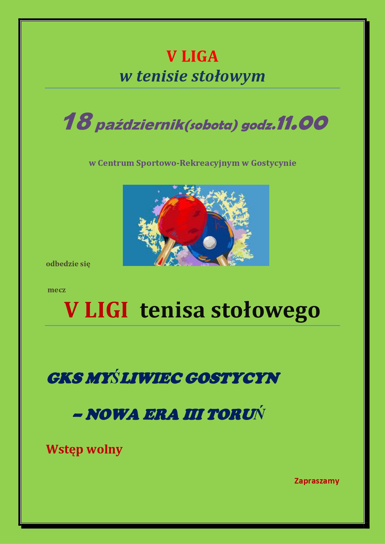 Zapraszamy na mecz V Ligi tenisa stołowego