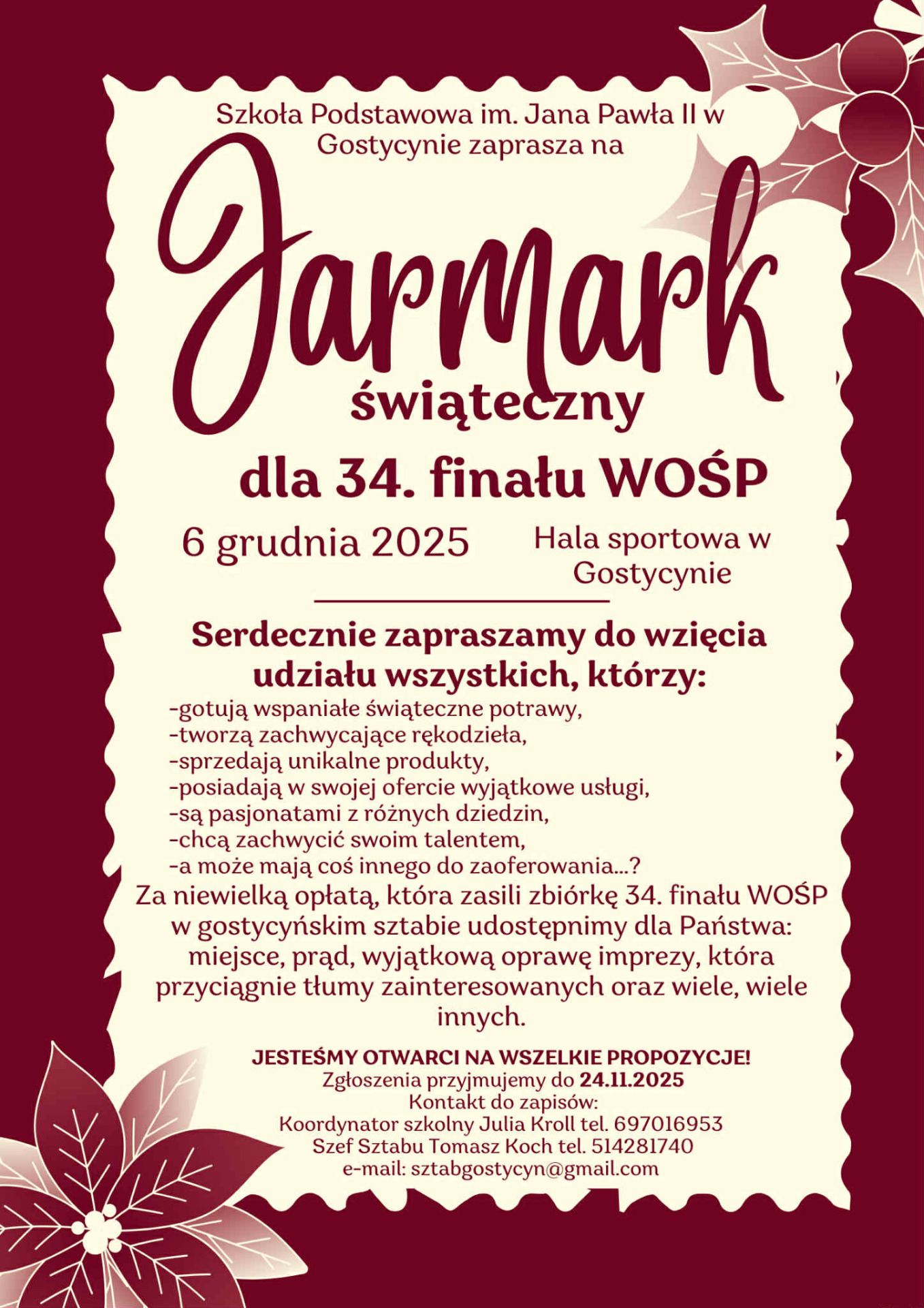 Już 6 grudnia (sobota) w Centrum Sportowo – Rekreacyjnym w Gostycynie odbędzie się Jarmark Świąteczny, organizowany na rzecz 34. Finału Wielkiej Orkiestry Świątecznej Pomocy. Do udziału w wydarzeniu zaprasza Szkoła Podstawowa w Gostycynie wraz ze współorganizatorami.
