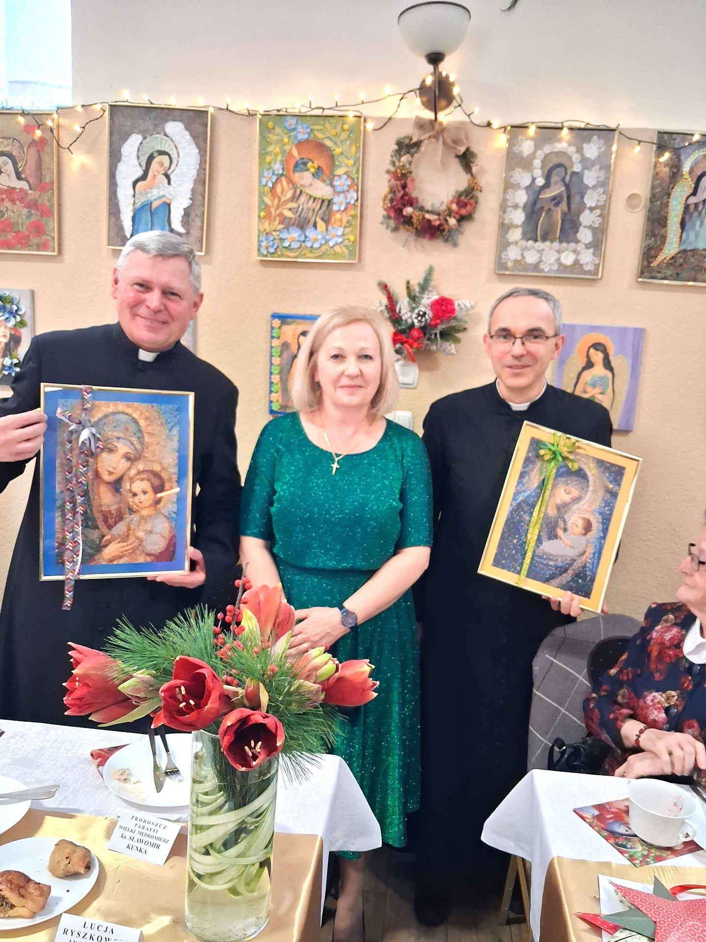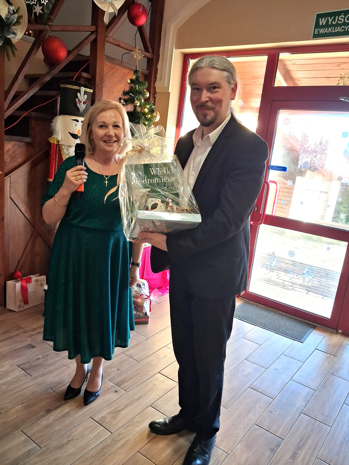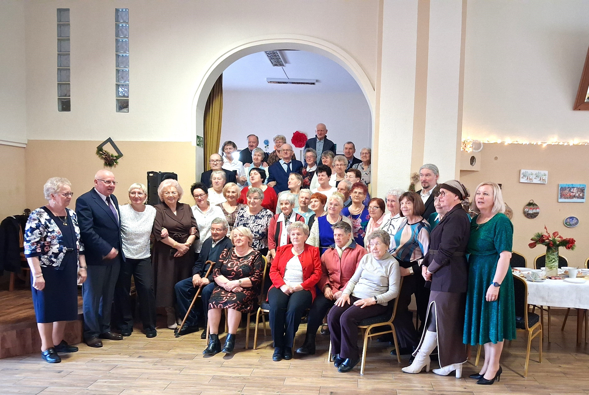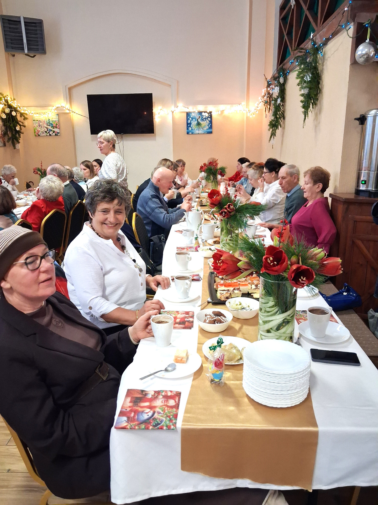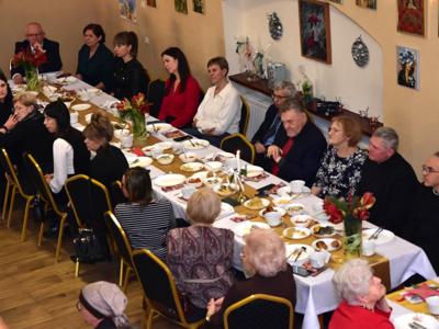 Piosenką „Opowieść o Bożym Narodzeniu”, w piątek 19 grudnia 2025 r. Pan Mirosław Barczuk – rehabilitant, animator kultury, członek Fundacji „Środowisko Wybrzeża” przywitał wszystkie zaproszone osoby na spotkaniu wigilijnym dla Seniorów z placówek wsparcia dziennego: Dziennego Domu Senior+ z Gostycyna i Klubu Senior+, w Wielkim Mędromierzu oraz przedstawicieli klubów z terenu Gminy Gostycyn. Kluby reprezentowali goście w osobach: Pani Grażyna Kida – Przewodnicząca Klubu Seniora „Wrzos” w Gostycynie, Pan Paweł Kaźmierczak – Przewodniczący Klubu Seniora „Malwa” w Pruszczu i Pan Ryszard Kielbratowski – Przewodniczący Klubu Seniora „Grzybek” z Gostycyna. Na spotkaniu obecni byli przedstawiciele władz lokalnych i zaproszeni goście: Pan Andrzej Kłos i Jan Mysiak – wiceprzewodniczący Rady Gminy Gostycyn, Pani Hanna Kufel Sekretarz Gminy, Pani Wiesława Błach – Prezes Spółki „Kamionka”, Sołtysi: Pani Katarzyna Łapka - Sołtys Sołectwa Wielki Mędromierz, Pan Jerzy Ochała – Sołtys Sołectwa Gostycyn, Pani Anna Goźlińska – Dyrektor Powiatowego Centrum Pomocy Rodzinie, Pani Agata Frohlke – Dyrektor Domu dla Dzieci w Gostycynie i Żalnie, Pani Elżbieta Danecka – Prowadząca Rodzinny Dom Pomocy w Wielkim Mędromierzu, Instruktor Klubu Senior+ Pani Łucja Ryszkowska, pracownicy Urzędu Gminy i GOPS współpracujący z Klubami oraz przyjaciele Seniorów i Pani Anna Lipska – redaktor „Tygodnika Tucholskiego”. Prowadzący uroczystość Pan Mirosław Barczuk podkreślił, że to spotkanie - to tradycja w Klubie zapoczątkowana w ubiegłym roku. Zarówno w Polsce jak również na całym świecie, w czasie adwentu - ludzie spotykają się w swoich lokalnych wspólnotach. Potrzebując duchowej głębi, prowadzący wspomniał o doświadczeniach z dzieciństwa: uczestnictwa w roratach, czy rodzinnej tradycji zdobienia choinki. Wspomniał, że to nie materialne aspekty świąt są najważniejsze, ale spokój, radość i porządek wewnętrzny. Bez udziału Pana Boga święta tracą sens. Przywitał Księży naszych dwóch Parafii, na terenie których funkcjonują placówki wsparcia dziennego, Parafii Stanisława Biskupa i Męczennika w Wielkim Mędromierzu - Proboszcza ks. Sławomira Kunka i Parafii pw. Św. Marcina Proboszcza ks. Ireneusz Machut. Prowadząc świąteczny ceremoniał Ksiądz Sławomir Kunka odczytał Ewangelię o Narodzinach Pana Jezusa w Betlejem. Seniorzy uczęszczający do Klubu Senior+ jako gospodarze miejsca odpalili 4 świece od świecy - symbolizującej Światło Chrystusa i zapalili na czterech stołach przygotowanych do wieczerzy – to dla wszystkich mieszkających na północy, południu, wschodzie i zachodzie. Proboszcz ks. Ireneusz Machut przekazał życzenia świąteczne mające charakter religijny i duchowy obecnym. Z ust Kapłana popłynęły przepiękne życzenia na nadchodzący nowy rok. Po wspólnej modlitwie uczestnicy uroczystości podzielili się podarowanym przez Księży Proboszczów opłatkiem - symbolem pojednania i przebaczenia, znakiem przyjaźni i miłości składając sobie życzenia. Podczas składania życzeń rozbrzmiewały słowa piosenki „Eleni” – „Maleńka przyszła miłość”. W tym miejscu Dorota Gromowska – Zastępca Wójta, również w imieniu Wójta Gminy Pana Ireneusza Kucharskiego,(właśnie w tym dniu Pan Wójt odbierał z rąk Wojewody Kujawsko-Pomorskiego wyróżnienie za realizację Programu „Senior +” za 10 lat funkcjonowania placówek wsparcia dziennego. Byliśmy w 2015 r. jedną z dwóch Gmin w województwie: Gostycyn i Janikowo, które przystąpiły do programu) oraz samorządowców złożyła życzenia dla wszystkich mieszkańców Gminy Gostycyn.” Życzymy zdrowia – bo jest największą wartością, radości, spełnienia marzeń, spotkań w gronie najbliższych, wzajemnej życzliwości i spokoju. Niech rok 2026 będzie pełen wiary, a wszystkie kryzysy na świecie zostaną w sposób pokojowy rozwiązane”. Słowa podziękowania od władz zostały skierowane do Pani Łucji Ryszkowskiej – za prowadzenie warsztatów artystycznych, do Pani Darii Buczkowskiej – za piękne kwiaty, które stanowiły ozdobę stołu i do Pana Mirosława Barczuka – za warsztaty rehabilitacyjne, zajęcia gimnastyczne, prowadzenie zajęć z kinezy i fizjoterapii grupowej oraz oprawę muzyczną i nagłośnienie. Podziękowaniami obdarowano Seniorów za pracę i zaangażowanie i wspólne przygotowanie uroczystości. Dorota Gromowska podkreśliła, że na uwagę zasługuje wystawa prac Seniorów. Prace, które zostały wyeksponowane to całoroczny dorobek Seniorów, a prace powstały podczas cyklicznych zajęć w Klubie. Prowadzący uroczystość podkreślając, że Boże Narodzenie - to czas obfitujący w piękne zwyczaje, a o jego niezwykłości w dużej mierze decydują polskie zamiłowanie do biesiadowania i gościnność. Potrawy na wigilijnym stole to nieodłączny element naszej tradycji. W taki oto sposób zaprosił gości do poczęstunku. Nadszedł też czas na muzykę i śpiew, a one zawsze podnosiły człowieka ponad jego ułomnością – w tym szczególnym dniu prowadzący przedstawił obecnym gościa Pana Michała Hajduczenia. Niezwykły gość – to wokalista, kontrabasista, kompozytor, aranżer, psalmista. Odznaczony odznaką honorową „Zasłużony dla Kultury Polskiej” (2019). Absolwent Wydziału Wokalno-Aktorskiego i Wydziału Instrumentalnego Akademii Muzycznej w Bydgoszczy. Psalmista w Cerkwiach Prawosławnych w Ciechocinku i Toruniu. Do Seniorów i gości przybył również Gwiazdor - Michał, i przyniósł prezenty – skromne pamiątki swojej postaci. Towarzyszyły mu dwie Śnieżynki: Kasia i Paulina. Spotkanie zakończyło się sesją wspólnych zdjęć.