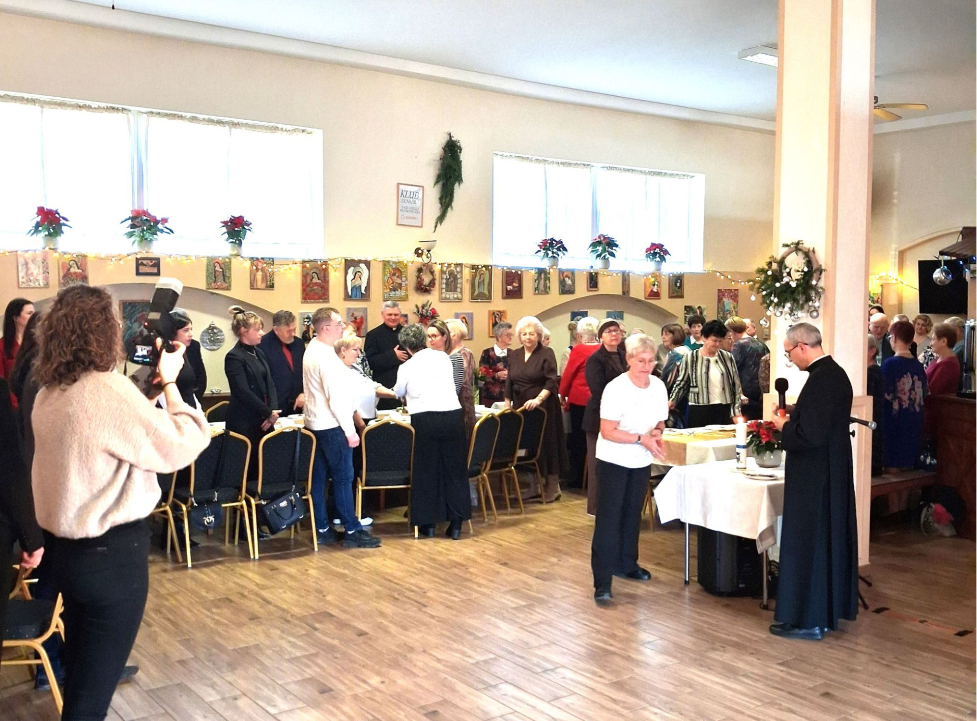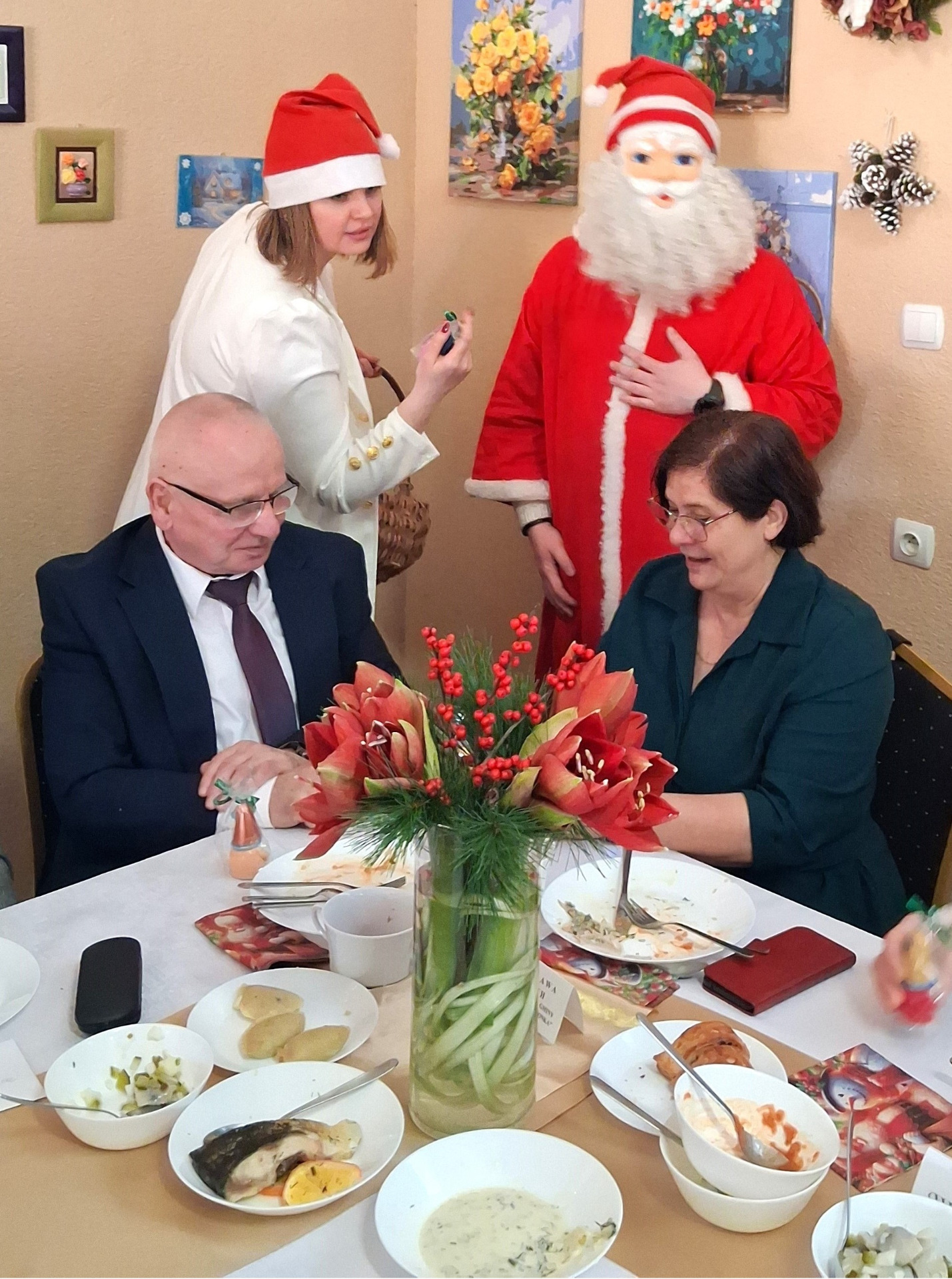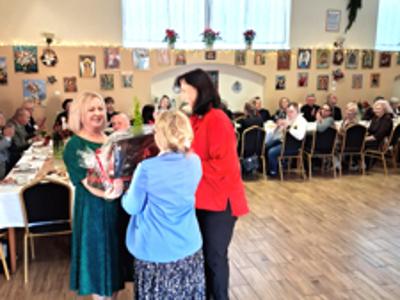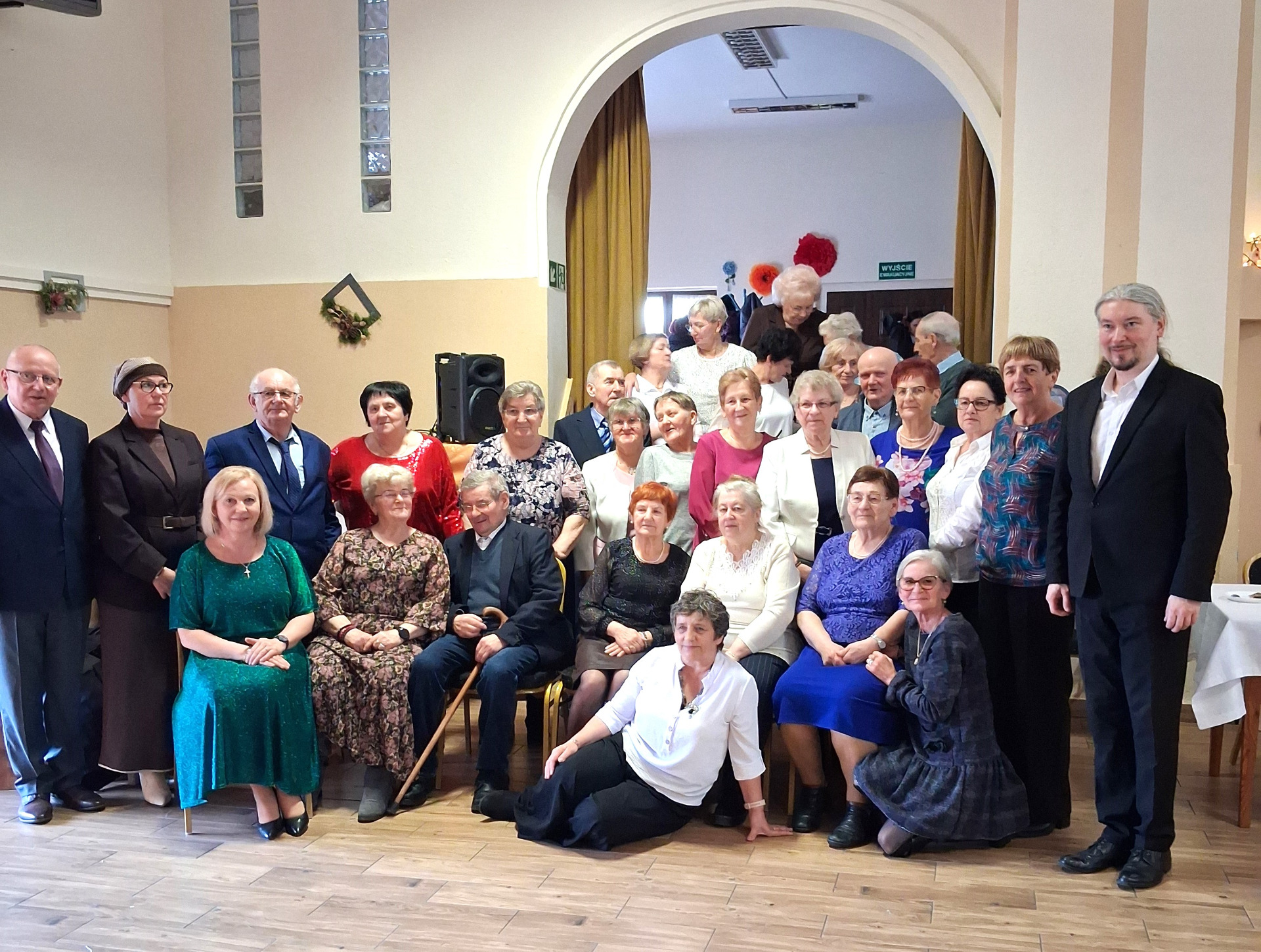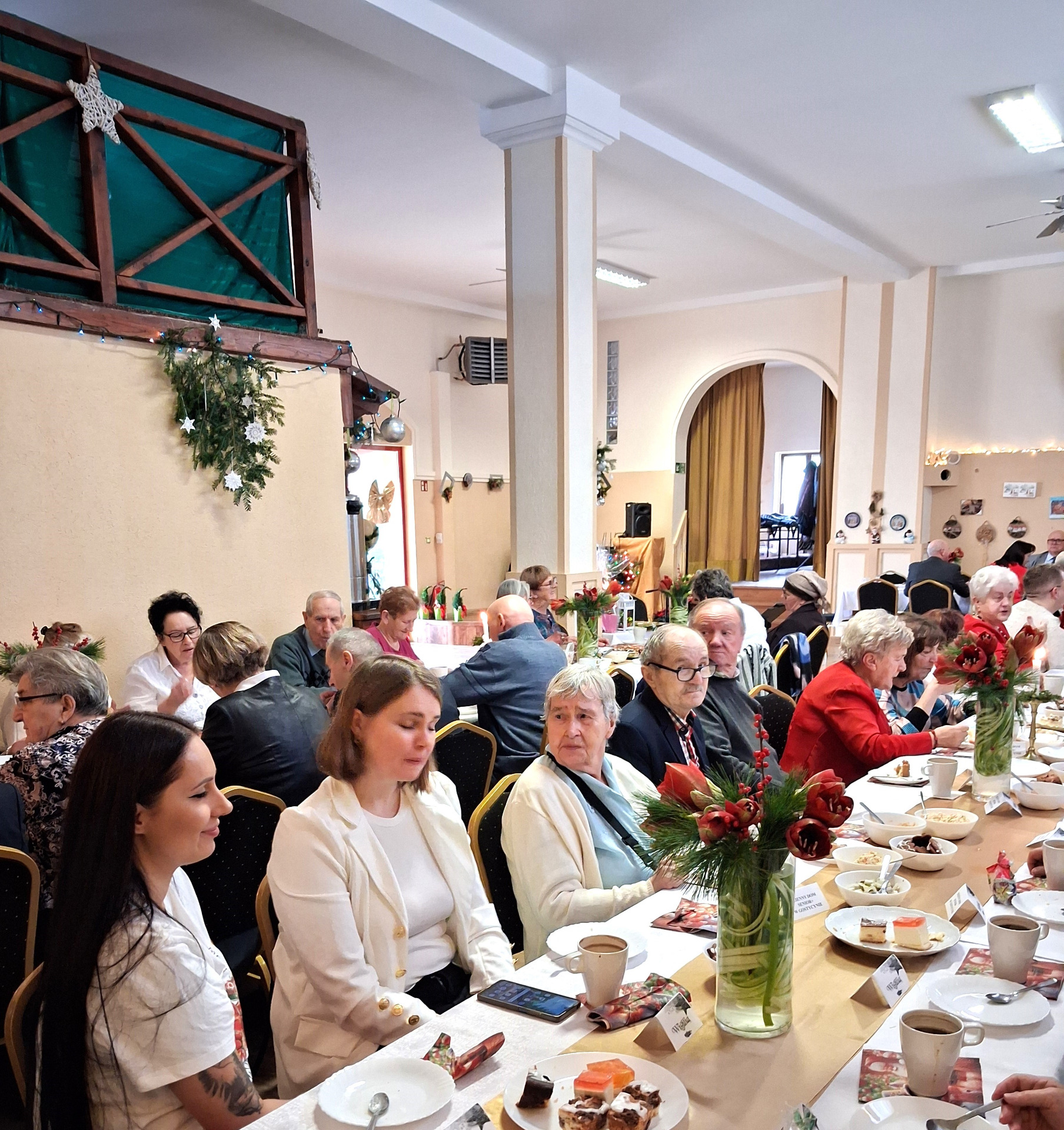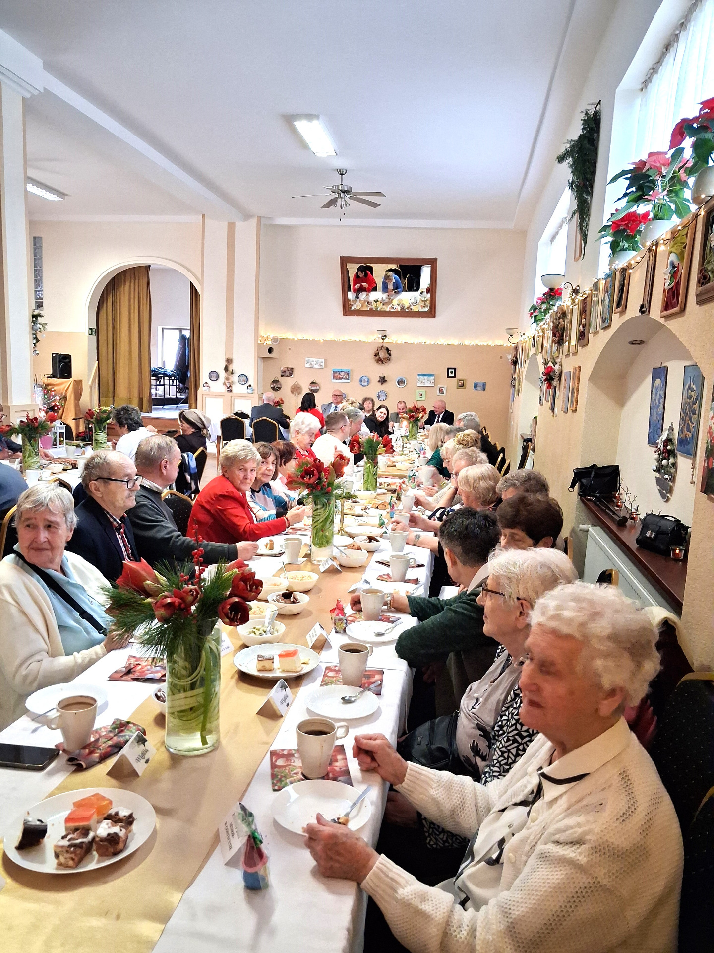 Piosenką „Opowieść o Bożym Narodzeniu”, w piątek 19 grudnia 2025 r. Pan Mirosław Barczuk – rehabilitant, animator kultury, członek Fundacji „Środowisko Wybrzeża” przywitał wszystkie zaproszone osoby na spotkaniu wigilijnym dla Seniorów z placówek wsparcia dziennego: Dziennego Domu Senior+ z Gostycyna i Klubu Senior+, w Wielkim Mędromierzu oraz przedstawicieli klubów z terenu Gminy Gostycyn. Kluby reprezentowali goście w osobach: Pani Grażyna Kida – Przewodnicząca Klubu Seniora „Wrzos” w Gostycynie, Pan Paweł Kaźmierczak – Przewodniczący Klubu Seniora „Malwa” w Pruszczu i Pan Ryszard Kielbratowski – Przewodniczący Klubu Seniora „Grzybek” z Gostycyna. Na spotkaniu obecni byli przedstawiciele władz lokalnych i zaproszeni goście: Pan Andrzej Kłos i Jan Mysiak – wiceprzewodniczący Rady Gminy Gostycyn, Pani Hanna Kufel Sekretarz Gminy, Pani Wiesława Błach – Prezes Spółki „Kamionka”, Sołtysi: Pani Katarzyna Łapka - Sołtys Sołectwa Wielki Mędromierz, Pan Jerzy Ochała – Sołtys Sołectwa Gostycyn, Pani Anna Goźlińska – Dyrektor Powiatowego Centrum Pomocy Rodzinie, Pani Agata Frohlke – Dyrektor Domu dla Dzieci w Gostycynie i Żalnie, Pani Elżbieta Danecka – Prowadząca Rodzinny Dom Pomocy w Wielkim Mędromierzu, Instruktor Klubu Senior+ Pani Łucja Ryszkowska, pracownicy Urzędu Gminy i GOPS współpracujący z Klubami oraz przyjaciele Seniorów i Pani Anna Lipska – redaktor „Tygodnika Tucholskiego”. Prowadzący uroczystość Pan Mirosław Barczuk podkreślił, że to spotkanie - to tradycja w Klubie zapoczątkowana w ubiegłym roku. Zarówno w Polsce jak również na całym świecie, w czasie adwentu - ludzie spotykają się w swoich lokalnych wspólnotach. Potrzebując duchowej głębi, prowadzący wspomniał o doświadczeniach z dzieciństwa: uczestnictwa w roratach, czy rodzinnej tradycji zdobienia choinki. Wspomniał, że to nie materialne aspekty świąt są najważniejsze, ale spokój, radość i porządek wewnętrzny. Bez udziału Pana Boga święta tracą sens. Przywitał Księży naszych dwóch Parafii, na terenie których funkcjonują placówki wsparcia dziennego, Parafii Stanisława Biskupa i Męczennika w Wielkim Mędromierzu - Proboszcza ks. Sławomira Kunka i Parafii pw. Św. Marcina Proboszcza ks. Ireneusz Machut. Prowadząc świąteczny ceremoniał Ksiądz Sławomir Kunka odczytał Ewangelię o Narodzinach Pana Jezusa w Betlejem. Seniorzy uczęszczający do Klubu Senior+ jako gospodarze miejsca odpalili 4 świece od świecy - symbolizującej Światło Chrystusa i zapalili na czterech stołach przygotowanych do wieczerzy – to dla wszystkich mieszkających na północy, południu, wschodzie i zachodzie. Proboszcz ks. Ireneusz Machut przekazał życzenia świąteczne mające charakter religijny i duchowy obecnym. Z ust Kapłana popłynęły przepiękne życzenia na nadchodzący nowy rok. Po wspólnej modlitwie uczestnicy uroczystości podzielili się podarowanym przez Księży Proboszczów opłatkiem - symbolem pojednania i przebaczenia, znakiem przyjaźni i miłości składając sobie życzenia. Podczas składania życzeń rozbrzmiewały słowa piosenki „Eleni” – „Maleńka przyszła miłość”. W tym miejscu Dorota Gromowska – Zastępca Wójta, również w imieniu Wójta Gminy Pana Ireneusza Kucharskiego,(właśnie w tym dniu Pan Wójt odbierał z rąk Wojewody Kujawsko-Pomorskiego wyróżnienie za realizację Programu „Senior +” za 10 lat funkcjonowania placówek wsparcia dziennego. Byliśmy w 2015 r. jedną z dwóch Gmin w województwie: Gostycyn i Janikowo, które przystąpiły do programu) oraz samorządowców złożyła życzenia dla wszystkich mieszkańców Gminy Gostycyn.” Życzymy zdrowia – bo jest największą wartością, radości, spełnienia marzeń, spotkań w gronie najbliższych, wzajemnej życzliwości i spokoju. Niech rok 2026 będzie pełen wiary, a wszystkie kryzysy na świecie zostaną w sposób pokojowy rozwiązane”. Słowa podziękowania od władz zostały skierowane do Pani Łucji Ryszkowskiej – za prowadzenie warsztatów artystycznych, do Pani Darii Buczkowskiej – za piękne kwiaty, które stanowiły ozdobę stołu i do Pana Mirosława Barczuka – za warsztaty rehabilitacyjne, zajęcia gimnastyczne, prowadzenie zajęć z kinezy i fizjoterapii grupowej oraz oprawę muzyczną i nagłośnienie. Podziękowaniami obdarowano Seniorów za pracę i zaangażowanie i wspólne przygotowanie uroczystości. Dorota Gromowska podkreśliła, że na uwagę zasługuje wystawa prac Seniorów. Prace, które zostały wyeksponowane to całoroczny dorobek Seniorów, a prace powstały podczas cyklicznych zajęć w Klubie. Prowadzący uroczystość podkreślając, że Boże Narodzenie - to czas obfitujący w piękne zwyczaje, a o jego niezwykłości w dużej mierze decydują polskie zamiłowanie do biesiadowania i gościnność. Potrawy na wigilijnym stole to nieodłączny element naszej tradycji. W taki oto sposób zaprosił gości do poczęstunku. Nadszedł też czas na muzykę i śpiew, a one zawsze podnosiły człowieka ponad jego ułomnością – w tym szczególnym dniu prowadzący przedstawił obecnym gościa Pana Michała Hajduczenia. Niezwykły gość – to wokalista, kontrabasista, kompozytor, aranżer, psalmista. Odznaczony odznaką honorową „Zasłużony dla Kultury Polskiej” (2019). Absolwent Wydziału Wokalno-Aktorskiego i Wydziału Instrumentalnego Akademii Muzycznej w Bydgoszczy. Psalmista w Cerkwiach Prawosławnych w Ciechocinku i Toruniu. Do Seniorów i gości przybył również Gwiazdor - Michał, i przyniósł prezenty – skromne pamiątki swojej postaci. Towarzyszyły mu dwie Śnieżynki: Kasia i Paulina. Spotkanie zakończyło się sesją wspólnych zdjęć.