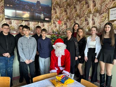 Spotkania w klasach: Po części oficjalnej uczniowie wraz z wychowawcami udali się do sal. Przy odświętnie nakrytych stołach dzielono się opłatkiem, składano sobie życzenia i degustowano wigilijne potrawy przygotowane przez rodziców.