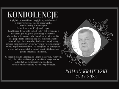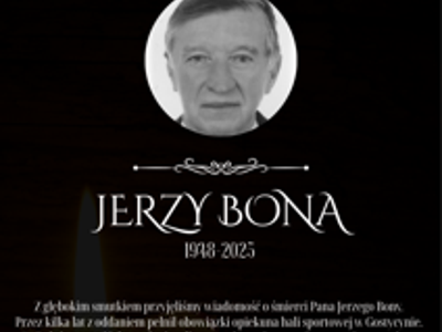Z głębokim smutkiem przyjęliśmy wiadomość o śmierci Pana Jerzego Bony. Pan Jerzy przez kilka lat, przed odejściem na emeryturę, z oddaniem pełnił obowiązki opiekuna hali sportowej w Gostycynie, brał również czynny udział i nadzorował budowę tego obiektu. Pochodził z Małego Gacna, miał dwoje rodzeństwa. Ukończył technikum ceramiczne w Bydgoszczy. Swoje życie zawodowe związał z Tucholą i Gostycynem, pracował m.in. w OBM, SUW, RZBW czy SKR. Swoje kwalifikacje budowlane wykorzystywał w pracy. Kierował stolarnią i betoniarnią w Gostycynie, Lubiewie i Błądzimiu. Był również kierownikiem prywatnych budów. Zapamiętamy go jako jako osobę rzetelną, odpowiedzialną i oddaną wykonywanym obowiązkom. Pan Jerzy Bona zmarł 26 grudnia 2025r. Pogrzeb odbędzie się 31 grudnia o godzinie 10.00 w kościele parafialnym w Gostycynie.