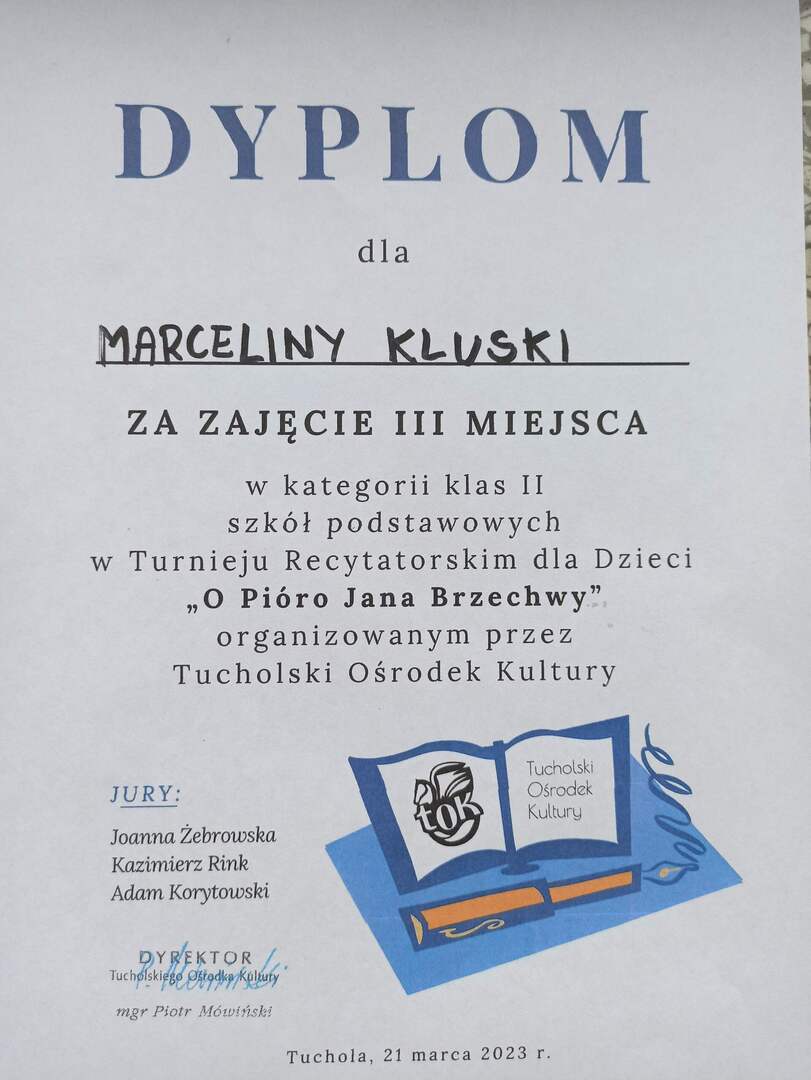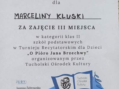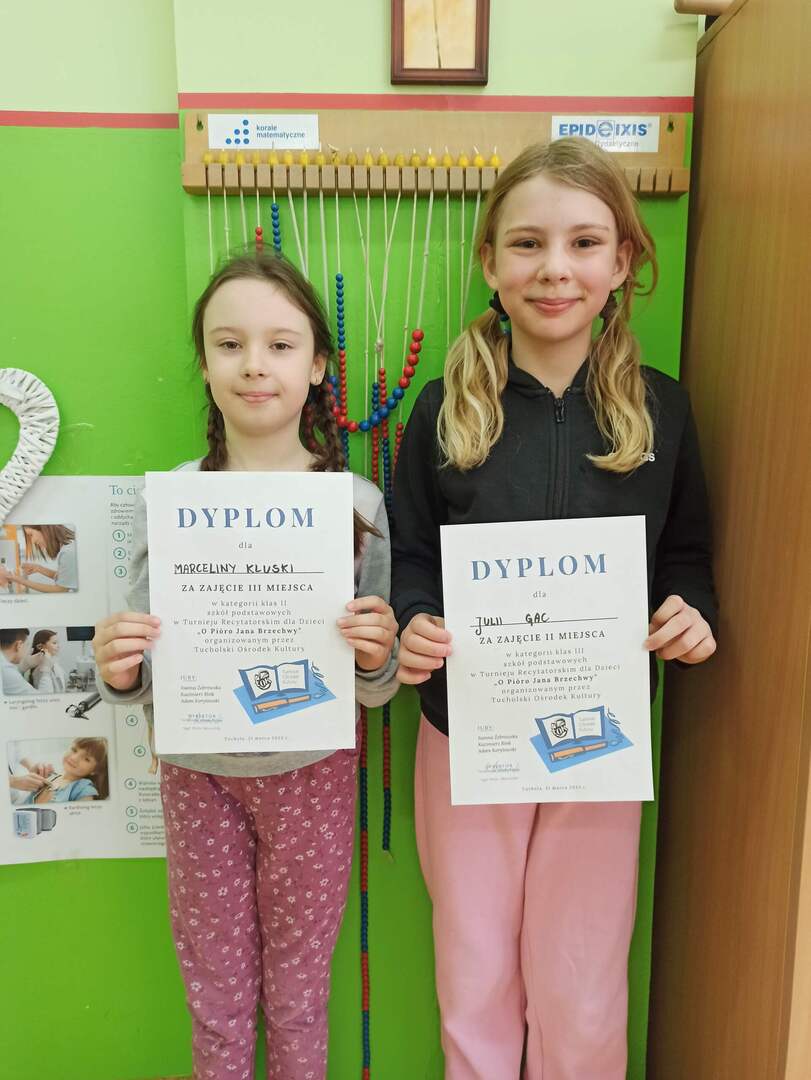 Dwie uczennice Szkoły Podstawowej im. Jana Pawła II w Gostycynie odniosły sukces podczas powiatowego Turnieju Recytatorskiego dla Dzieci "O Pióro Jana Brzechwy" organizowanego przez Tucholski Ośrodek Kultury w dniu 21 marca 2023 r.