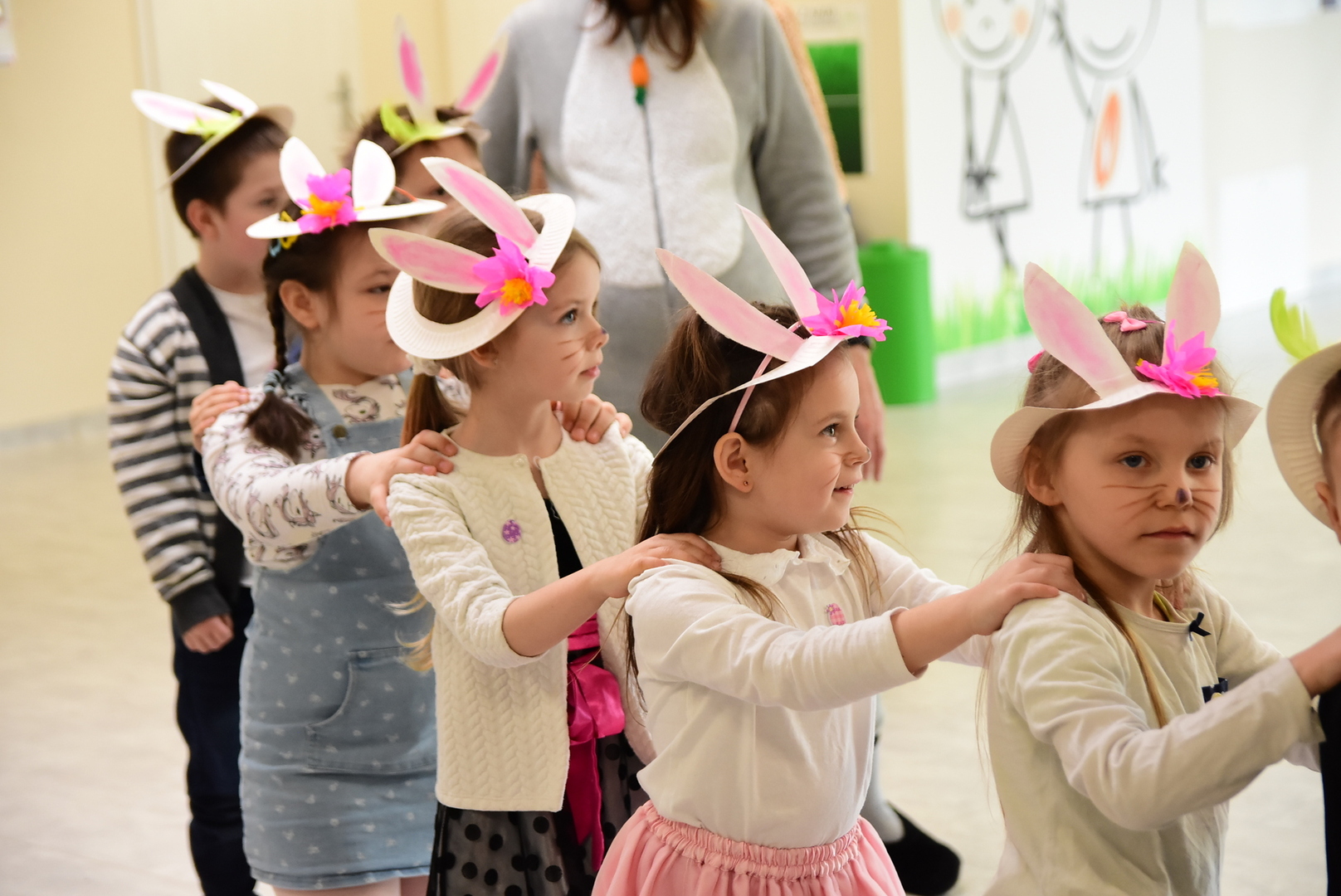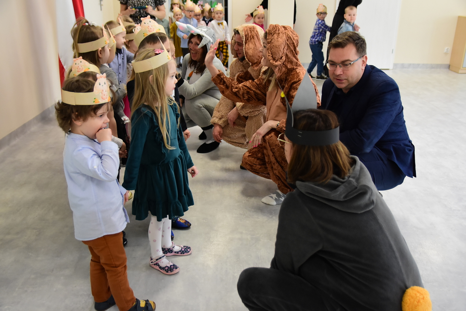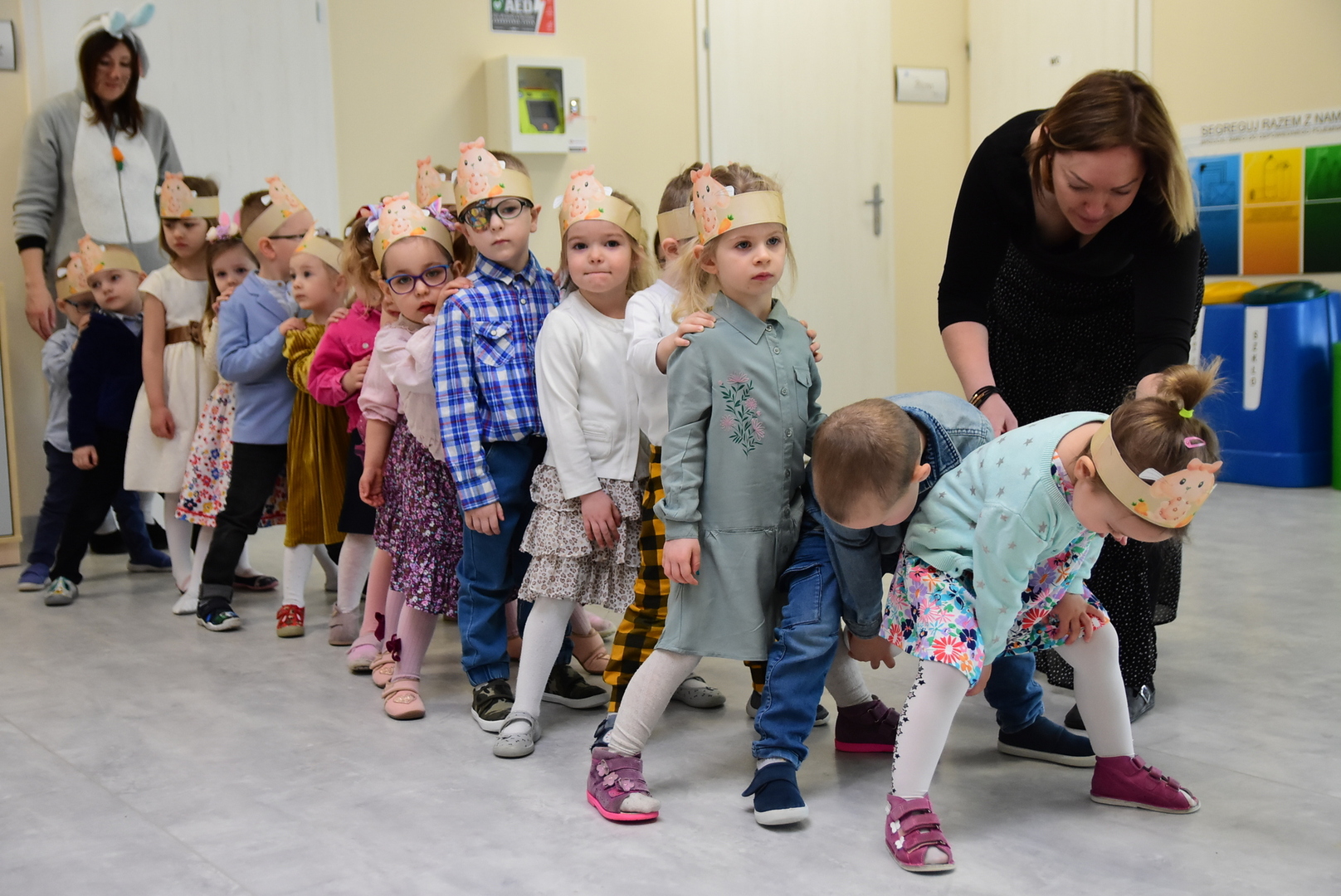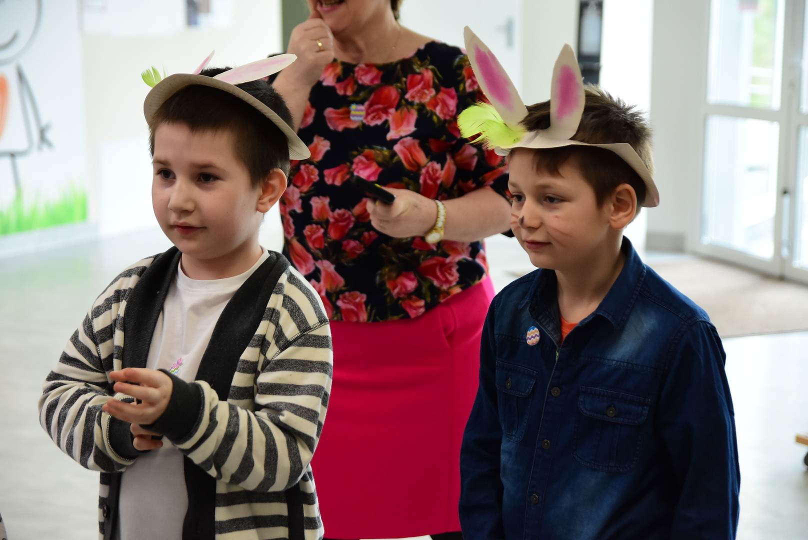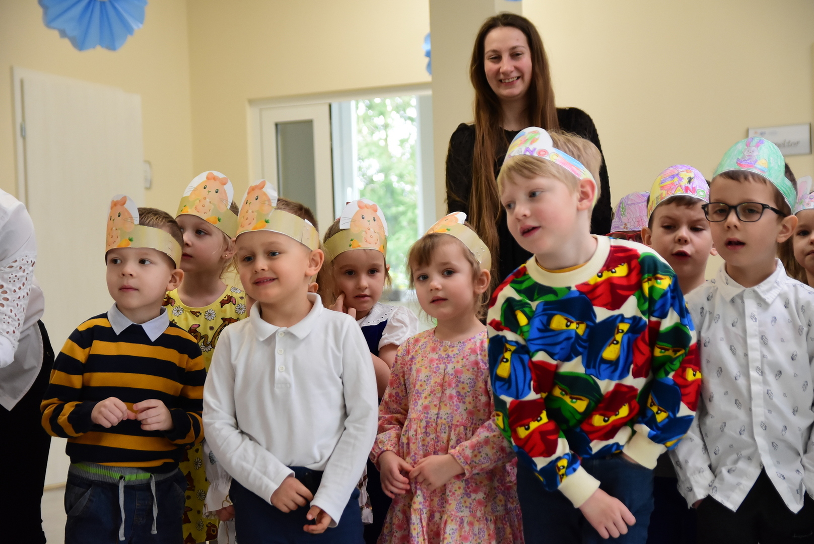 Jedną z najmilszych i najprzyjemniejszych dla dzieci tradycji wielkanocnych jest „zajączek”. Przychodzi, a w zasadzie kica z koszyczkiem wielkanocnym i zostawia prezenty – czasem są to słodkości, czasem inne upominki. Do dzieci z Przedszkola „Niezapominajka” w Gostycynie „zajączek” przybył dziś z samego rana. Tak naprawdę, nie był to jeden „zajączek”, a kilka. Mało tego, kicusiom towarzyszyła „kurka”, która w przedszkolu szukała pisanek. Rolę świątecznych bohaterów odegrali przedstawiciele niezwykle aktywnej rady rodziców. Bawili się wraz z maluchami. Było wspólne kicanie, tańce oraz zabawy z jajkiem. Na koniec rodzice wręczyli dzieciom wielkanocne upominki. Były to kolorowanki i przeznaczone dla każdej z grup przedszkolnych komplety klocków. „Zajączkom” tego dnia, przy wręczaniu prezentów towarzyszył wójt gminy Gostycyn Ireneusz Kucharski, no i oczywiście dyrektor przedszkola Ewa Czerwińska. Oboje dali się wkręcić w wir zabawy z dziećmi.