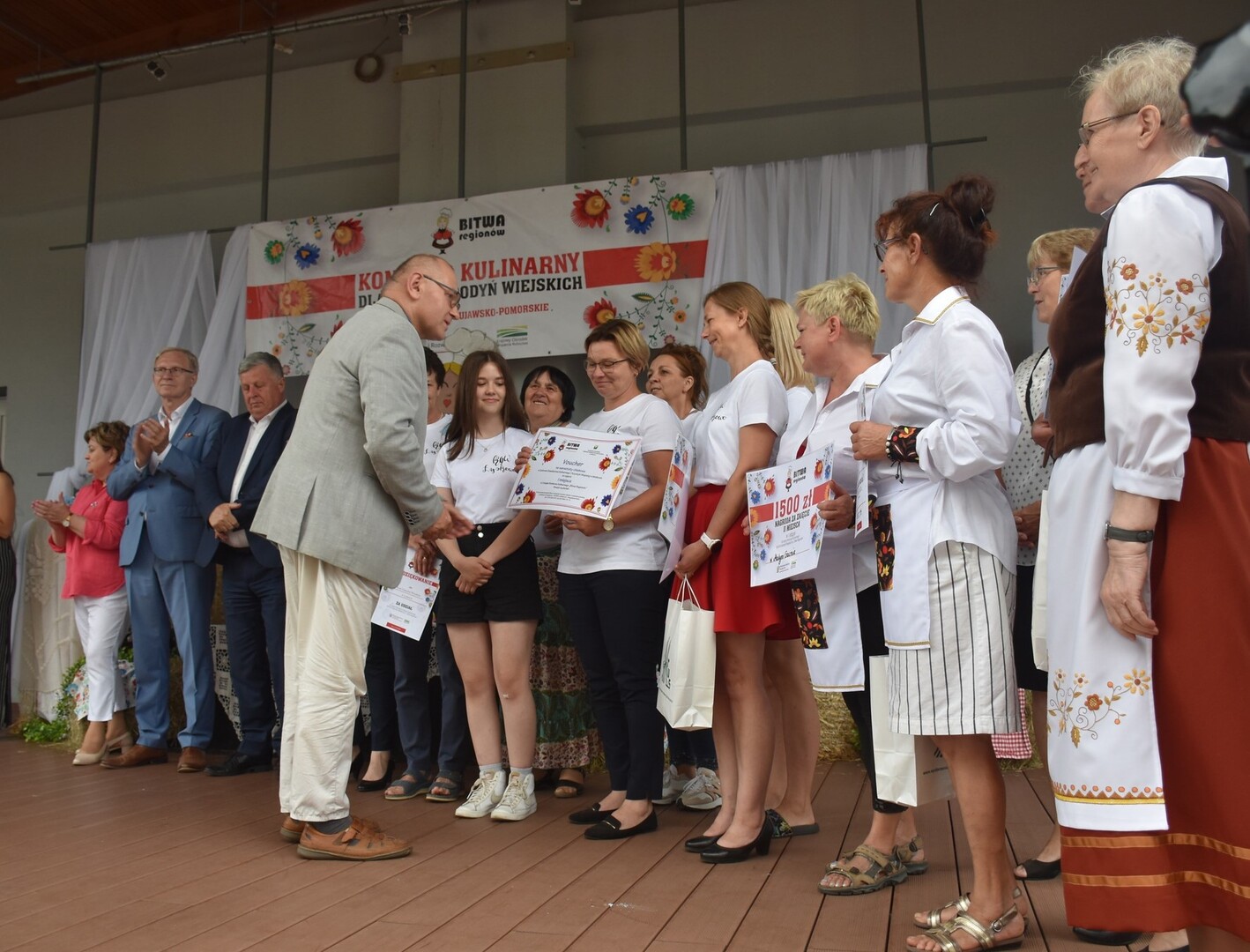 I w tym momencie przechodzimy do najważniejszej wiadomości. Otóż najwyższą ocenę „Bitwy Regionów” w naszym powiecie otrzymała potrawa przygotowana przez KGW w Łyskowie. Był to pasztet z królika. Drugie miejsce zajęło KGW w Małym Gacnie, które serwowało zupę grzybową z kluseczkami lanymi i odrobiną śmietany. Trzecie miejsce zajęło KGW w Lińsku, które podało zupę z suszonych owoców i grzybów. Jury oceniało nie tylko smak potrawy, ale także jej wygląd i sposób podania. Oceniających interesowało także z jakich składników przygotowano danie, skąd pochodziły składniki, co skłoniło panie do przygotowanie właśnie tego dania czy skąd miały na nie przepis. Zwyciężczynie otrzymały odpowiednio nagrodę w kwocie 2000 zł, 1500 zł i 1000 zł.