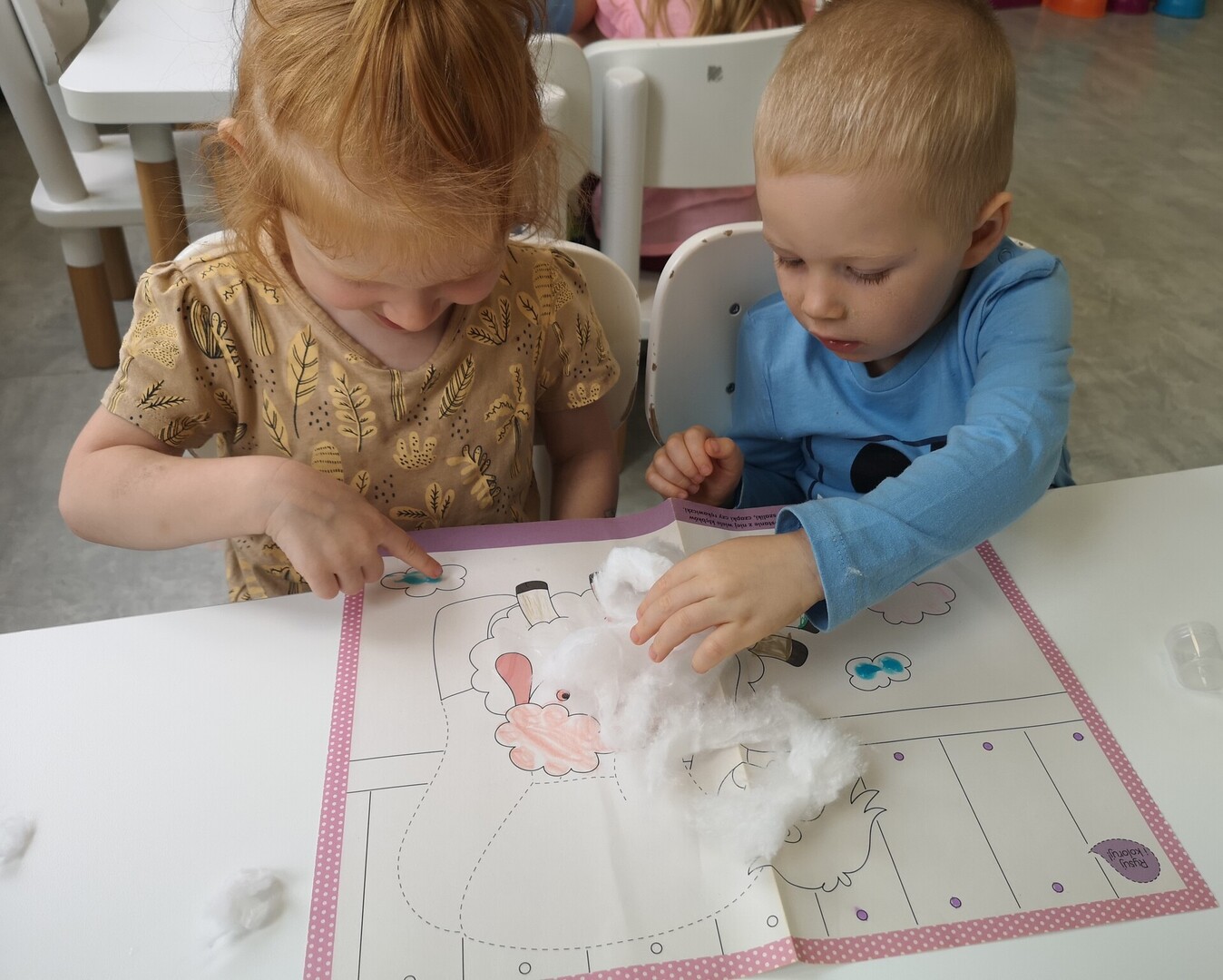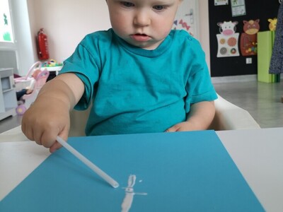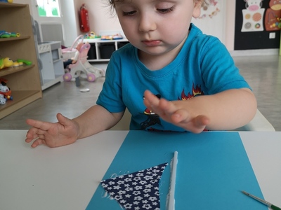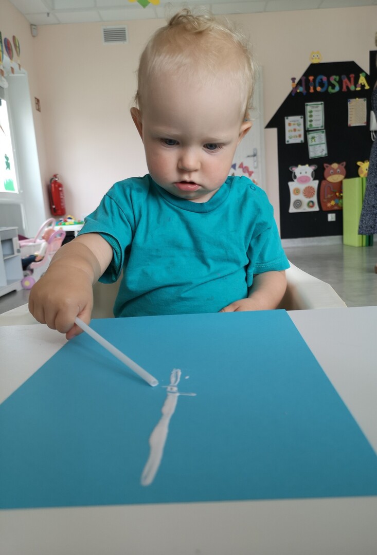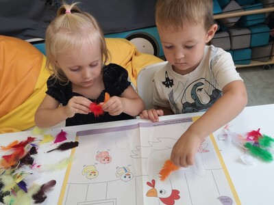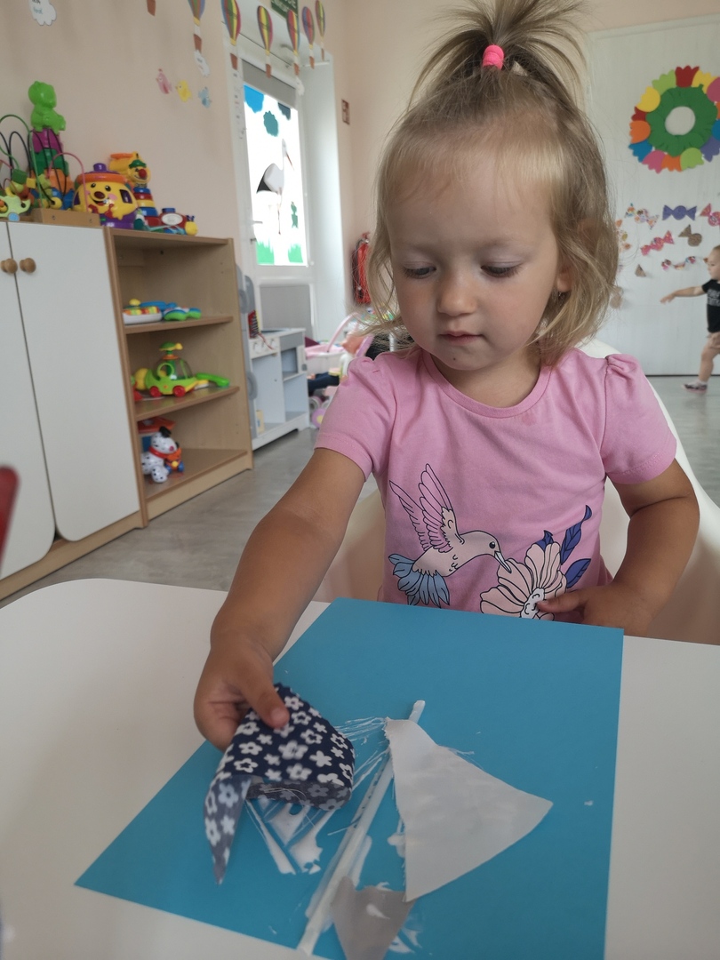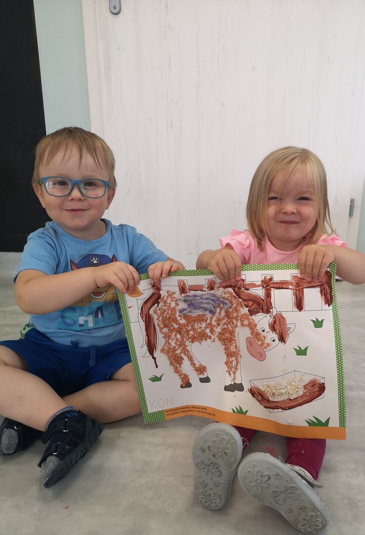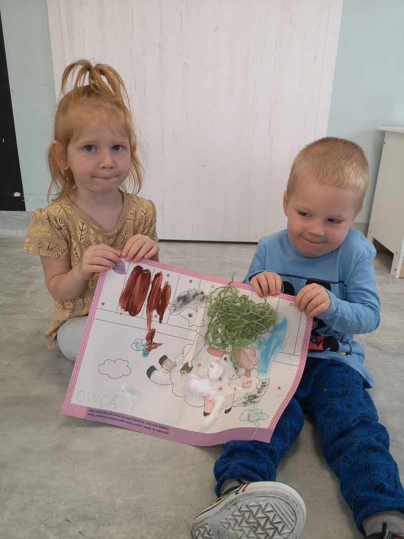 W ostatnich dniach, z uwagi na deszczową pogodę maluszki i ich opiekunowie zrezygnowali ze spacerów na rzecz zajęć plastycznych i zaprzyjaźnili się z klejem oraz różnego rodzaju materiałami. "Stokrotki" parami wyklejały zwierzęta gospodarskie, a "Pierwiosnki" tworzyły fantastyczne łódki. Z prac powstała wspaniała, kolorowa galeria.