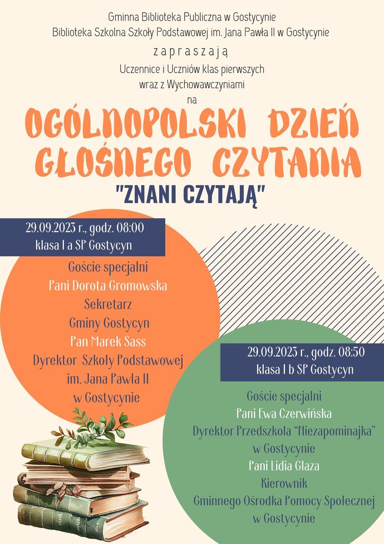 W najbliższy piątek (29.09.2023 r.) w naszej bibliotece obchodzić będziemy Ogólnopolski Dzień Głośnego Czytania. Z tej okazji specjalni goście: Dorota Gromowska - sekretarz Gminy Gostycyn, Ewa Czerwińska - dyrektor Przedszkola Publicznego "Niezapominajka" w Gostycynie, Lidia Glaza - kierownik GOPS w Gostycynie oraz Marek Sass - dyrektor SP w Gostycynie poczytają uczennicom i uczniom klas pierwszych fragmenty książki "Historie zamiecione pod dywan" Agnieszki Zimnowodzkiej.