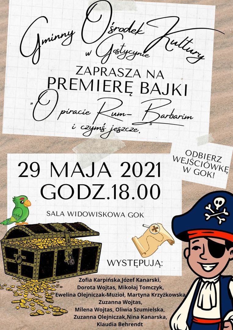 Już 29 maja(sobota )w sali widowiskowej GOK, pierwsza odsłona Teatru Dorosłego. Na deskach sceny spektakl pt. ''O piracie Rum-Barbarim i czymś jeszcze.''