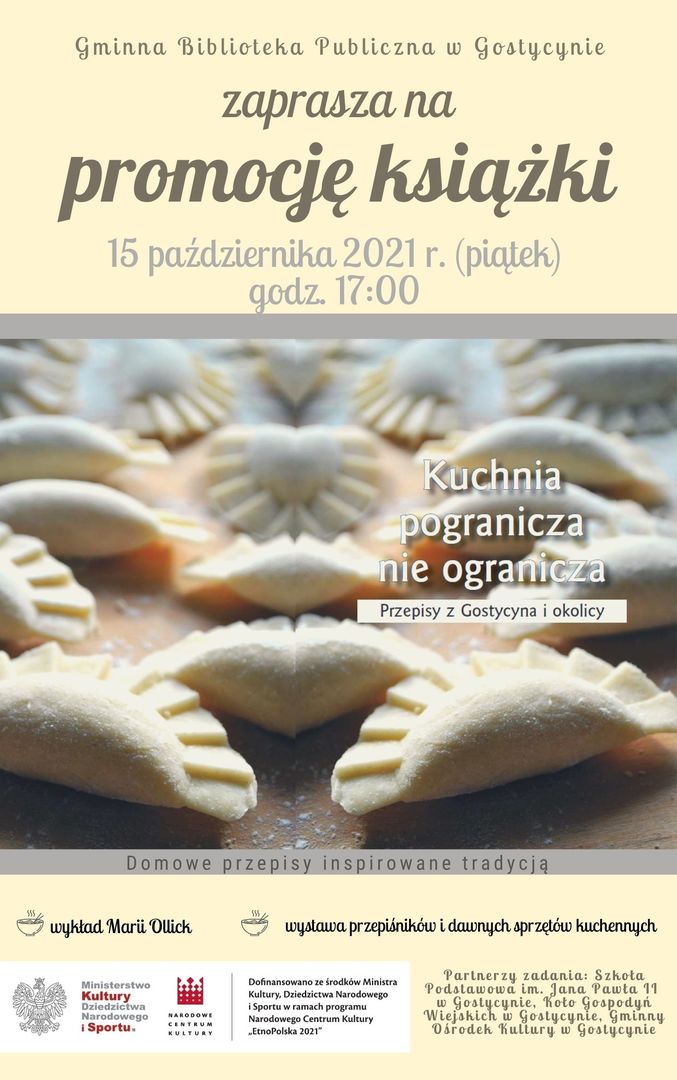 Niezmiernie nam miło zaprosić wszystkich na promocję książki kulinarnej „Kuchnia pogranicza nie ogranicza. Przepisy z Gostycyna i okolicy”. W publikacji, w pierwszej części, znajdują się przepisy tradycyjne wybrane przez jury w konkursie „Wysznufrane z kajetu”. W drugiej części są nowe receptury, które wzięły udział w konkursie „Kolewrotne smaki”. Książka została opatrzona wstępem o tradycjach kulinarnych Gminy Gostycyn autorstwa doktora Marka Sassa, historyka, regionalisty, dyrektora Szkoły Podstawowej w Gostycynie. Na promocji wykład wygłosi Maria Ollick – regionalistka, prezeska Borowiackiego Towarzystwa Kultury.