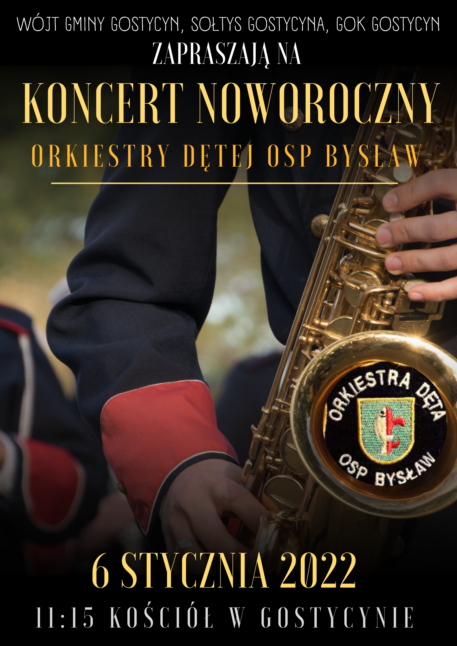 WÓJT GMINY GOSTYCYN, SOŁTYS GOSTYCYNA,GOK GOSTYCYN SERDECZNIE ZAPRASZAJĄ NA KONCERT NOWOROCZNY ORKIESTRY DĘTEJ OSP W BYSŁAWIU, 6 STYCZNIA O GODZ. 11:15 W KOŚCIELE PARAFIALNYM W GOSTYCYNIE.